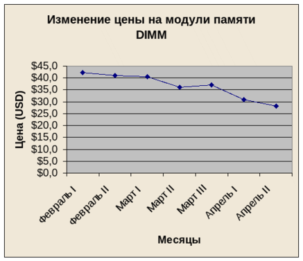 Сейчас наиболее быстро падают цены на «чемоданный товар»: в первую очередь это модули памяти (DIMM) и процессоры. Так цены на память в нашей фирме за февраль-апрель 1999 года упала с 42 до 28 доллара за 32Mb DIMM (Диаграмма 2). Цена на процессор Intel Pentium II 400Mhz за февраль упала с 480 до 250 долларов (т.е. почти в 2 раза!). Второе место по динамике падения цен принадлежит жестким дискам, видеокартам и сетевому оборудованию. По жестким дискам достаточно ограничен круг производителей, но в связи с переходом на новую технологию цена на младшие модели (2.5-4GB) по оптовому отделу снизилась в среднем на 20%, на старшие модели (5-14Gb) на 35%. Медленнее всего цены снижаются на популярные модели известных фирм-производителей: например, лазерные принтеры HP (цена на принтер 6L за всю годовую историю его производства ни разу не падала более 5%, причем у наших конкурентов она снижалась не более чем на 3.4%), мониторы ViewSonic, Sony и т.д.