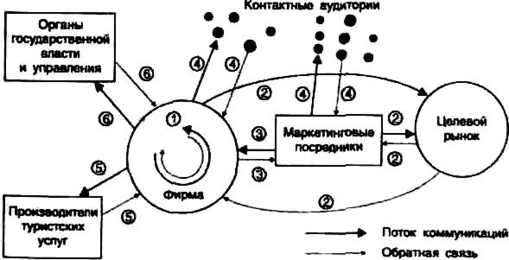 3. Маркетинговые посредники. В их число входят торговые посредники (турбюро, экскурсионные бюро, туристские агентства), а также лица и фирмы, способствующие выполнению отдельных маркетинговых функций (например, агентства маркетинговых исследований, рекламные агентства и т.д.). Особенностью данного адресата коммуникаций является то, что маркетинговый посредник (например, рекламное агентство) может быть промежуточным звеном в коммуникации фирмы с целевым рынком и контактными аудиториями.