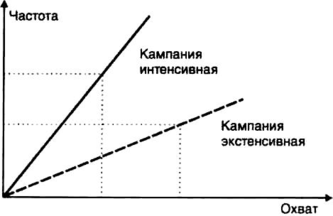 В зависимости от целей маркетинга и коммуникационной стратегии туристские фирмы ориентируются либо на относительно небольшую группу постоянных клиентов либо на максимально большую аудиторию. В первом случае речь идет об интенсивной рекламной кампании (Рис. 2.11), когда акцент делается на увеличение числа контактов каждого индивидуума с рекламным обращением (например, с целью обновления устаревшего образа туристского продукта или создания нового, не существующего ранее образа). Второй случай предполагает экспансивную рекламную кампанию, направленную на охват аудитории (например, для информирования максимального количества потребителей о туристских продуктах фирмы).