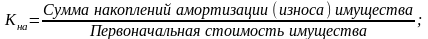 Коэффициент накопления амортизации (Кна) характеризует интенсивность высвобождения иммобилизованных ресурсов в основных средствах и нематериальных активах. Его значение показывает, какая доля основных средств и нематериальных активов уже погашена амортизационными отчислениями предприятия и рассчитывается по формуле: