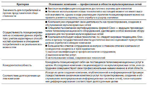 1. Компания - профессионал в области мультисервисных сетей. В данном случае акцент сделан на профессионализме компании в узкой области телекоммуникаций. Для реализации позиционирования по данному основанию можно использовать атрибут «Высокая квалификация сотрудников», т.к. профессионализм компании определяют ее сотрудники, и атрибут «Активное использование новых технологий», т.к. при создании мультисервисных сетей используются передовые информационные технологии.
