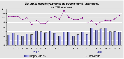 Зменшення населення відбулося виключно за рахунок природного скорочення – 28,8 тис. осіб, у той час як міграційний приріст становив 1 тис. осіб. Триває зростання народжуваності: у січні 2009 року в Україні народилось 42 тис. дітей, це на 0,4% більше порівняно з січнем 2008 року. Найвищий рівень народжуваності у Рівненській та Волинській областях (14,1 та 14 осіб на 1000 населення, відповідно), найнижчий – у Луганській, Сумській та Черкаській (по 9,1 особи на 1000 населення). Водночас зменшується смертність населення.