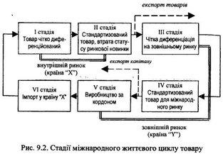 Існують певні відмінності у стадіях життєвого циклу товару (ЖЦТ) для внутрішніх і міжнародних ринків. Якщо на внутрішньому ринку товар традиційно проходить чотири стадії життєвого циклу (стадію проникнення товару на ринок, стадію зростання, стадію насичення і стадію спаду), то в міжнародному масштабі класичним є проходження шести стадій життєвого циклу (рис. 9.2).