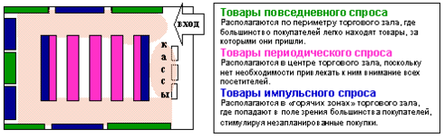 Поскольку товары повседневного спроса востребованы наибольшим числом посетителей, то около данных точек продажи скапливается достаточно большое количество покупателей. Поэтому данные товарные группы должны располагаться по внешнему периметру торгового зала, чтобы сделать покупку наиболее удобной. Если покупатели будут испытывать неудобства, то они будут стремиться поскорее покинуть торговый зал. Это не только уменьшает время пребывания покупателя в магазине (а значит, снижает количество импульсных покупок), но также может натолкнуть покупателя на мысль посетить другой магазин в следующий раз.