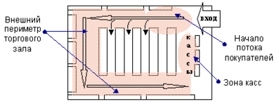 В магазине существует естественное направление движения покупателей, которое должно определяться еще на стадии проектирования магазина: расположение входа, торгового оборудования в зале и касс. Движение потока покупателей должно быть рассчитано заранее и подобрано с максимальной выгодой, предоставляя на обозрение покупателю как можно больше товаров.
