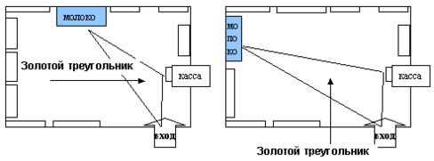 Если проследить путь покупателя в небольшом торговом зале, то можно отметить существование так называемого "золотого треугольника" - площади, расположенной между входной дверью, кассой и самым ходовым товаром в магазине. Ходовой товар в зависимости от специфики магазина может быть разным. Это может быть стеллаж с газетами или сигаретами, холодильник с напитками, секции молочных или хлебобулочных изделий. Товар, интересующий большинство покупателей, должен быть расположен внутри так называемого "золотого треугольника".