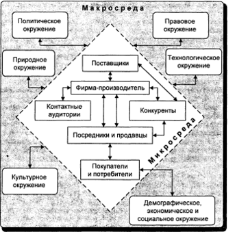Внешняя среда или то окружение, в котором действует предприятие, состоит, главным образом, из участников рыночных отношений. От их поведения, целевых установок и интересов в большей или меньшей степени зависят благополучие предприятия, результаты его хозяйственной и коммерческой деятельности. Микросреда маркетинга – часть маркетинговой среды, включающая физических и юридических лиц, а также рыночные факторы, непосредственно влияющие на маркетинговую деятельность организации.