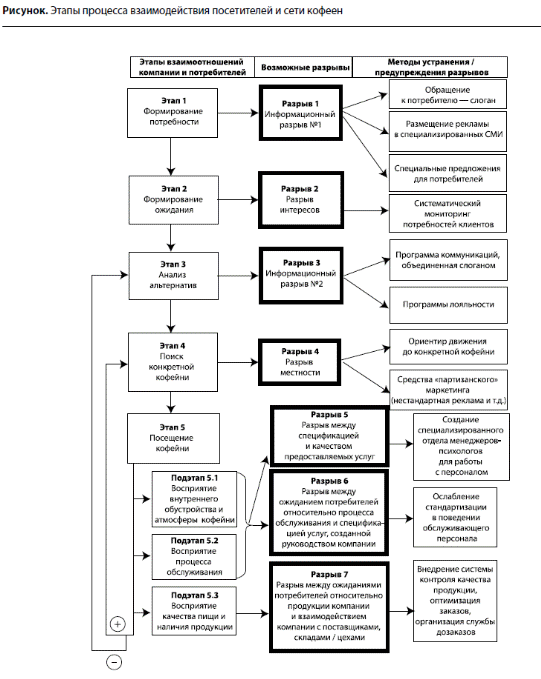 В ходе своего исследования мы попытались обозначить разрывы, потенциально возможные на каждом этапе взаимодействия кофейни и ее гостей. При этом мы использовали упомянутую выше методику точек соприкосновения, в рамках которой были определены все возможные виды контактов посетителей и компании, виды несоответствия воспринимаемой услуги ожидаемой, причины такого несоответствия, а также возможные методы устранения возникших разрывов (см. рисунок).