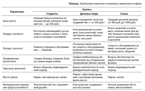Следует учесть, что кофейни относятся к сфере услуг, обладающей определенной спецификой, поэтому к традиционным четырем Р маркетинг-микса (product (продукт), price (цена), promotion (продвижение), place (каналы распределения)) добавляются еще три: персонал (personal), материальное окружение / психологическая обстановка (physical evidence), процесс (process).