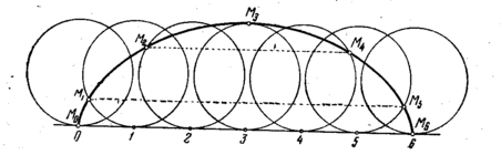 Чтобы построить на бумаге приближенно одну арку циклоиды, описанную при качении обруча диаметром, равным, например, трем сантиметрам, отложим на прямой отрезок, равный 3х3,14 = 9,42 см.