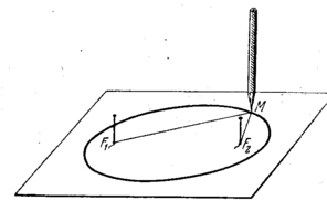 Чтобы получить полный эллипс, придется перекинуть нить на другую сторону от булавок, после того как будет описана одна половина эллипса. Очевидно, что сумма расстояний от острия М карандаша до булавочных проколов F1 и F2 остаётся неизменной во все время движения; эта сумма равна длине нити.