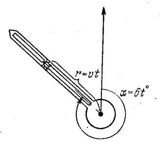 Вообразим бесконечно длинную секундную стрелку, по которой, начиная от центра циферблата, неутомимо бежит маленький жучок с постоянной скоростью v см/с. Через минуту жучок будет на расстоянии 60v см от центра, через две - 120v и т.д. Вообще, через t секунд после начала пробега расстояние жучка от центра будет равно vt см. За это время стрелка повернется на угол, содержащий 6 t° (ведь за одну секунду она успевает повернуться на угол 360°:60 = 6°). Поэтому положение жучка на плоскости циферблата через любое число t секунд после начала движения находится так. Нужно отложить от начального положения стрелки в направлении ее вращения угол а, содержащий 6t°, и отмерить от центра вдоль нового положения стрелки расстояние r = vt см. Тут мы и настигнем жучка (рис. 10.).