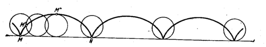 Приложим к нижнему краю классной доски линейку и будем катить по ней обруч или круг (картонный или деревянный), прижимая его к линейке и к доске. Если прикрепить к обручу или кругу кусок мела (в точке соприкосновения его с линейкой), то мел будет вычерчивать кривую (рис. 37), называемую циклоидой (что по-гречески значит «кругообразная»). Одному обороту обруча соответствует одна «арка» циклоиды MM'M''N', если обруч будет катиться дальше, то будут получаться еще и еще арки той же циклоиды.