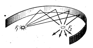 Если изогнуть узкую полоску хорошо отполированного металла по дуге эллипса и поместить точечный источник света («огонь») в одном фокусе, то лучи света, отразившись от полоски, соберутся в другом фокусе; поэтому и во втором фокусе будет также виден «огонь» - изображение первого (рис. 5.).