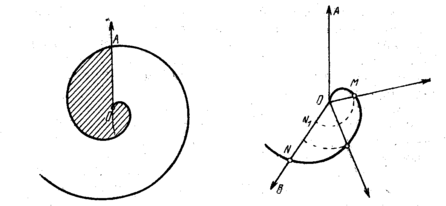 Самого Архимеда занимали, однако, другие, более трудные задачи, которые он сам поставил и решил: 1) найти площадь фигуры, ограниченной первым витком спирали (на рис. 11. она заштрихована); 2) получить способ построения касательной к спирали в какой-либо ее точке N.