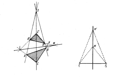 Прямая и окружность - две наиболее простые и вместе с тем наиболее замечательные по своим свойствам кривые. Любой человек знаком с прямой и окружностью больше, чем с другими кривыми. Но пусть он не думает, что ему хорошо известны все важнейшие свойства прямых и окружностей. Знает ли он, например, что если вершины двух треугольников АВС и A'B'C' лежат на трех прямых, пересекающихся в одной точке 5 (рис. 1), то тогда три точки М, К., L пересечения соответственных сторон треугольников АВ с А'В', ВС с В'С' и АС с А'С' должны находиться на одной и той же прямой?