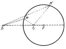 Читателю, конечно, известно, что точка М, которая движется по плоскости, оставаясь на равных расстояниях от двух неподвижных точек F1 и F2 той же плоскости, т. е. так, что MF1= MF2; описывает прямую (рис. 2). Но, вероятно, он затруднится ответить, какую кривую опишет точка М, если ее расстояние до точки F1 будет в определенное число раз превосходить расстояние до точки F2 (например, вдвое, как на рис. 3). Оказывается, что этой кривой является окружность. Следовательно, если точка М движется по плоскости так, что ее расстояние до одной из двух неподвижных точек F1 и F2 плоскости будет изменяться пропорционально расстоянию до другой точки:
