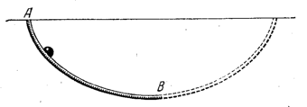 нему, приобретет скорость большую, чем на участке такой же длины прямолинейного желоба. Но если сделать начальную часть очень крутой и сравнительно длинной, то тогда часть, примыкающая к точке В, будет очень пологой и также сравнительно длинной; первую часть шарик пройдет быстро, вторую очень медленно и шарик может запоздать с приходом в точку