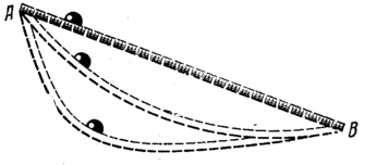 Рассмотрим такой вопрос: какую форму следует придать хорошо отшлифованному металлическому желобу, соединяющему две заданные точки А и В (рис. 8.), чтобы полированный металлический шарик скатывался по этому желобу из точки А в точку В в кратчайшее время? На первый взгляд кажется, что нужно остановиться на прямолинейном желобе, так как только вдоль него шарик пройдет кратчайший путь от А до В. Однако речь идет не о кратчайшем пути, а о кратчайшем времени; время же зависит не только от длины пути, но и от скорости, с которой бежит шарик. Если желоб прогнуть вниз, то его часть, начиная от точки А, будет круче опускаться вниз, чем в случае прямолинейного желоба, и шарик, падая по