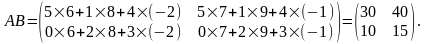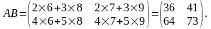 Таким образом, элемент произведения матриц А и В, стоящий в i-ой строке и j-ом столбце, равен сумме произведений элементов i-ой строки первой матрицы А на соответствующие элементы j-ого столбца второй матрицы В т.е.