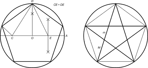 Пусть О - центр окружности, А - точка на окружности и Е - середина отрезка ОА. Перпендикуляр к радиусу ОА, восстановленный в точке О, пересекается с окружностью в точке D. Пользуясь циркулем, отложим на диаметре отрезок CE = ED. Длина стороны вписанного в окружность правильного пятиугольника равна DC. Откладываем на окружности отрезки DC и получим пять точек для начертания правильного пятиугольника. Соединяем углы пятиугольника через один диагоналями и получаем пентаграмму. Все иагонали пятиугольника делят друг друга на отрезки, связанные между собой золотой пропорцией.