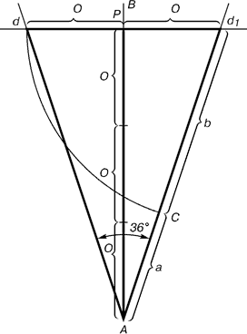 откладываем на линию Ad1, получая точку С. Она разделила линию Ad1 в пропорции золотого сечения. Линиями Ad1 и dd1 пользуются для построения «золотого»