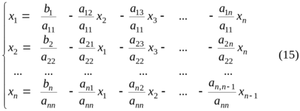 Выбираем произвольно начальные приближения неизвестных и подставляем в первое уравнение системы (17). Полученное первое приближение подставляем во второе уравнение системы и так далее до последнего уравнения. Аналогично строим вторые, третьи и т.д. итерации.