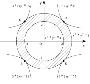 не принадлежит заданной области дифференцирования, значит стационарных точек внутри области нет, следовательно, наибольшее/наименьшее значение функцией достигается на границе области дифференцирования. Граница области ограничена окружностями