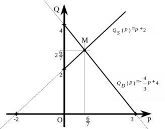 .к. функции QS(P) и QD(P) – линейные функции, то их графиками являются прямые, для построения которых достаточно определить их точки пересечения с осями координат. Они найдены, значит можно производить построение графика (рис.1).Найдем точку равновесия графиков функции спроса и предложения (М), в которой спрос равен предложению. Для этого решим систему: