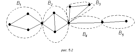 Например, граф, изображенный на рис. 5.2, содержит пять блоков Bi (i=1,2,3,4,5) (они обведены пунктирными линиями). Среди этих блоков В1, В2 и В3 –2-связные графы, а каждый из двух оставшихся является ребром.