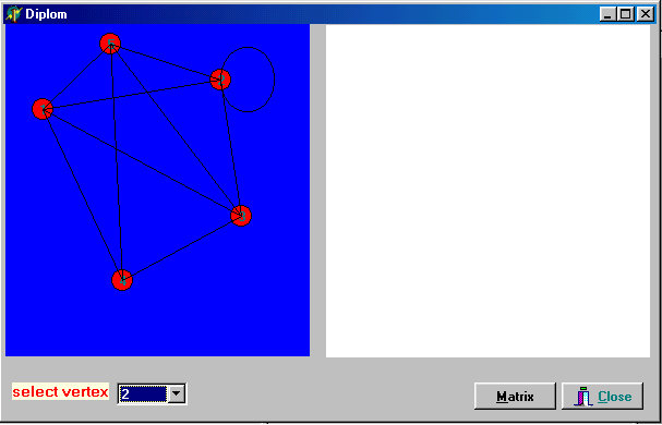 Вывод Целью моей дипломной работы была исследовать задачу на построение разреза в графе по вершине z. Был разработан алгоритм, который строит разрез по заданому графу. По данному алгоритму была написанна программа. Алгортм заключался в следующем: задается граф, по нем строится матрица смежности. В матрице суммируется строка и если при делении на два остаток от деления равен нулю, тогда данную вершину удаляют, а те вершины которые были смежные с ней соединяются между собой.