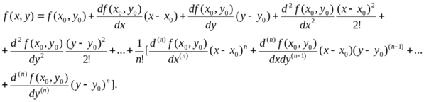 Если функция f(x, y) определена и непрерывна вместе с частными производными (до n-го порядка ), то существует разложение этой функции в ряд Тейлора :