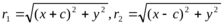 Так как F1 F2=2с и так как фокусы F1 и F2 расположены на оси Ох симметрично относительно начала координат, то они имеют соответственно координаты (—с; 0) и (+с; 0); приняв это во внимание находим: