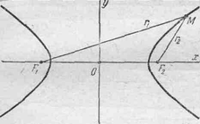 Пусть дана какая-нибудь гипербола с фокусами F1 и F2. Возьмем на плоскости произвольную точку М и обозначим ее координаты через х и у, а фокальные радиусы F1М и F2М через r1 и r2. Точка М будет находиться на (данной) гиперболе в том и только в том случае, когда