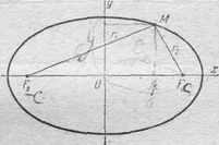 Возьмем на плоскости произвольную точку М и обозначим ее координаты через х и у. Обозначим, далее, через r1 и r2 расстояния от точки М до фокусов (r1 = F1М, r2 = F2М). Точка М будет находиться на данном эллипсе в том и только в том случае, когда