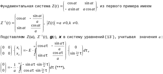 При данных значениях а однородная система (**) из 1-го примера имеет нетривиальное периодическое решение с периодом ω, тогда в соответствии с замечанием к теореме 2 линейная неоднородная система уравнений, соответствующая заданному дифференциальному уравнению , может или вообще не иметь периодических решений с периодом ω (для случая 2 необходимо установить несовместность системы уравнений (13)), или иметь несколько периодических решений с периодом ω (для случая 3 необходимо установить, что система уравнений (13) имеет бесконечное множество решений).