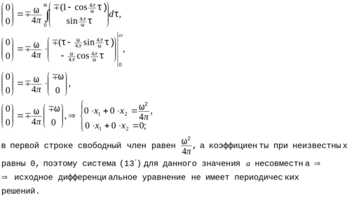 Таким образом,система (13') имеет бесконечное множество решений для данных значений а исходное дифференциальное уравнение имеет несколько линейно независимых периодических решений с периодом ω.