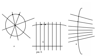 Так вот, первый вид пучков образован прямыми, имеющими общую точку – центр пучка (рис. 4а). Пучок расходящихся прямых – это перпендикуляры к одной прямой – оси пучка (рис. 4б). Из этого определения выходит интересное и, казалось бы, абсурдное утверждение, что два перпендикуляра к одной прямой непараллельны, и отличие от геометрии Евклида.