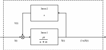 Капиталовложения слагаются из централизованных средств I(t) и отчислений от дохода U(t). Предположим, что отчисления регламентируются нормативом a < 1. Тогда функциональную структуру развития предприятия можно представить в виде модели с положительной обратной связью, состоящей из двух звеньев. Усилительное звено 2 отражает процесс выделения собственных капиталовложений при нормативе отчислений от объема реализации продукции a. Вместе с централизованными капиталовложениями собственные средства воздействуют на звено производства 1, изменяя стоимость ОПФ и объем дохода от реализации продукции X(t) в видединамической производственной функции.