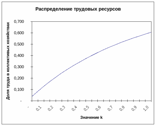 Отметим, что коэффициент варьируется именно частными хозяйствами, то есть они выбирают наиболее оптимальное распределение труда в зависимости от получаемой прибыли. Повышая плату за труд руководитель коллективного хозяйства влияет на выбор частными хозяйствами.