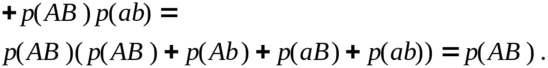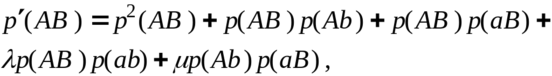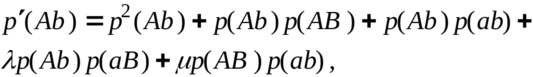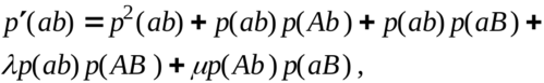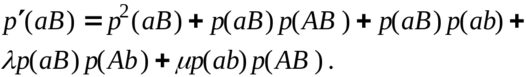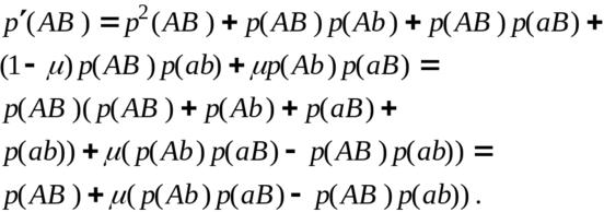 Дадим комментарии к правой части первой формулы (остальные формулы выписываются аналогично). Первое слагаемое - частота генотипа (AB)(AB). При мейозе каждая особь данного генотипа с единичной вероятность порождает гаметы (AB). Второе слагаемое - половинная частота генотипа (AB)(Ab). В силу сделанного выше замечания, несмотря на кроссиговер, каждая особь этого генотипа с вероятностью