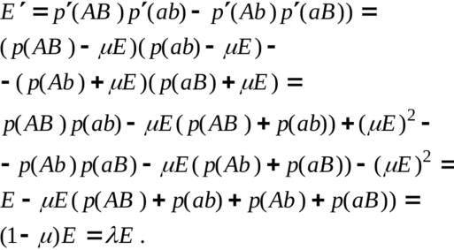 Обратимся к уравнениям, описывающим эволюцию в популяции с двумя двухаллельными локусами при условии кроссинговера. Частоты гамет в текущям и последующем поколениях будем обозначать как