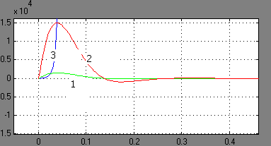 На Рис 3.7 приведена реакция системы при различных значениях i (цифрами обозначены: 1 - i =10-2; 2 - i =10-3; 3 - i =10-4;). Динамика изменения угла поворота при варьировании параметра i практически не изменяется. Из эксперимента видно, что коэффициент передачи редуктора i природным образом влияет на динамику системы, и ,что увеличение коэффициента приводит к увеличению максимальной амплитуды угловой скорости.