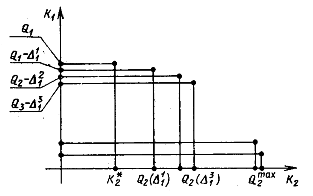 Далее рассматривают пару критериев K2 и K3 вновь назначают «пробные» величины уступок Q2(22), , ... и, решая 3) в задаче (1), отыскивают наибольшие значения третьего критерия Q3(12), Q3(22),... Полученные данные анализируют, назначают 2, переходят к следующей паре критериев К3, K4 и т. д.