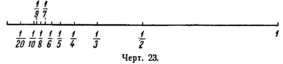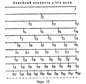 При рассмотрении различных долей единицы и дробей естественно поставить вопрос о сравнении их по величине, также кладется сравнение величин, измеряемых данными дробями. Для иллюстрации сравнительной величины долей единицы полезно на выбранной линейной единице от одного из ее концов отложить отрезки, соответствующие долям единицы (рис.7).