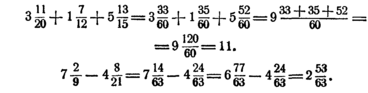 При вычитании дробей система упражнений имеет еще большее значение, чем при сложении, так как при вычитания иногда приходится уменьшаемое преобразовывать, что затрудняет учащихся. Постепенно усложняя упражнения, можно подготовить учащихся к усвоению трудных случаев вычитания. Рассмотрим различные случаи, которые могут быть положены в основу системы упражнений на вычитание дробей с одинаковыми знаменателями, а именно: 1) из дроби вычесть дробь; 2) из смешанного числа дробь, которая меньше дроби смешанного числа; 3) из единицы дробь; 4) из целого числа, большего единицы, дробь; 5) из числа, равного единице с дробью, вычесть дробь, которая больше дроби в уменьшаемом; 6) из смешанного числа смешанное, причем дробь вычитаемого меньше дроби уменьшаемого; 7) из целого смешанное число; 8) из смешанного смешанное число дробь которого больше дроби уменьшаемом. Примерная запись при сложении и вычитании дробей.