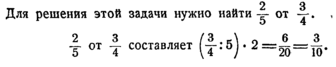 Перед введением определения действия умножения на дробь рассматривается решение задачи на нахождение части числа. В программе и в стабильном учебнике эта задача носит название: „нахождения дроби числа". Замена слова „части” словом „дроби" вызвана, очевидно, расширением рассматриваемой задачи; в стабильном учебнике рассматриваются и такие задачи, например: „найти