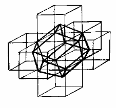 Решение. Кубами можно заполнить пространство. Рассмотрим часть кубической решетки, изображенной на рис.4. Средний куб оставим нетронутым, а в каждом из "окаймляющих" кубов проведем плоскости через все шесть пар противолежащих ребер. При этом "окаймляющие" кубы разобьются на шесть равных пирамид с квадратными основаниями и боковыми ребрами, равными половине диагонали куба. Пирамиды, примыкающие к нетронутому кубу, и образуют вместе с последним ромбический додекаэдр. Отсюда ясно, что ромбическими додекаэдрами можно заполнить все пространство. Как следствие получаем, что объем ромбического додекаэдра равен удвоенному объему куба, ребро которого совпадает с меньшей диагональю грани додекаэдра.