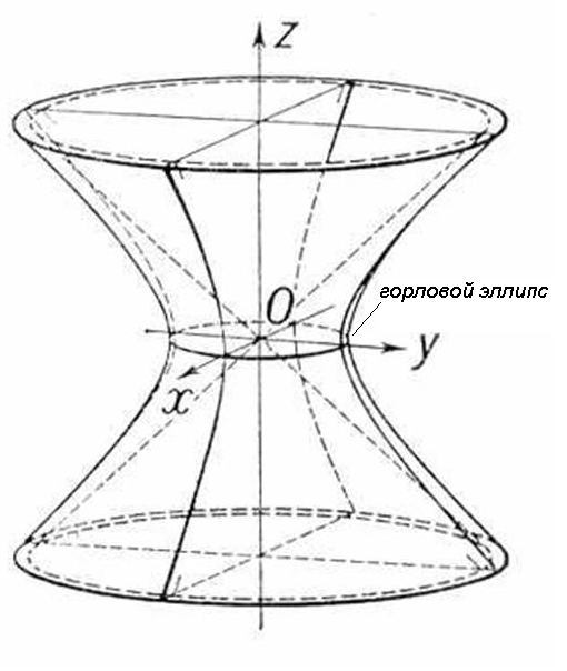 Таким образом, рассмотренные сечения позволяют изобразить однополосный гиперболоид в виде бесконечной трубки, бесконечно расширяющейся по мере удаления (по обе стороны) от плоскости Oxy.