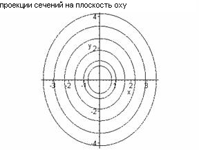 Рассмотрим линии пересечения с плоскостями, параллельными плоскости OXY. Все уравнения линий пересечений будут получаться из уравнения плоскости, в котором z будет заменена на некоторое число, равное расстоянию от пересекающей плоскости до плоскости OXY. Для более наглядного представления, я изобразил все полученные кривые в виде проекций на плоскость OXY. Изображения кривых представлены выше.